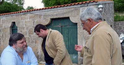 Da esq. para a dta., Tito Almiro e o seu inseparável charuto (hoje não veio no Bentley de 1956!), Dr. Carlos Santiago Silva, vice-presid. e o Dr. José Mário.Esta soberba e antiquíssima propriedade, estende-se por 70 hectares de pomar, vinha e castanheiro, na encosta a jusante de Sernancelhe.